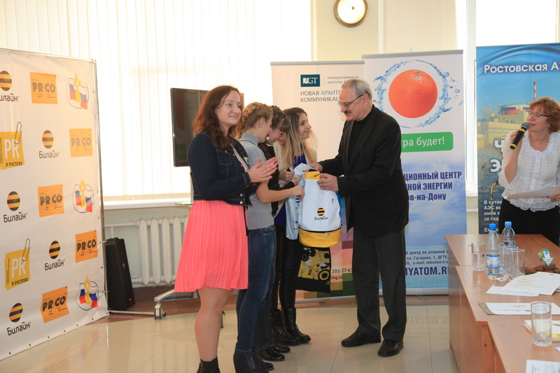 В двух номинациях пятнадцати командам было предложено подготовленное информационным центром задание: разработать PR-кампанию формирования позитивного отношения населения Ростовской области к строительству и вводу в эксплуатацию третьего и четвертого энергоблоков Ростовской атомной станции. Несмотря на сложность задания большинство участников смогли успешно с ним справиться и подготовить на профессиональном уровне проекты проведения информационно-разъяснительной работы с населением в период пуска новых блоков РоАЭС. Лучшие «атомные» проекты вошли в шорт-лист жюри и были заслушаны на пленарном заседании фестиваля. Это работа студентки 2 курса ДГТУ Анастасии Стрибной «Зеленый свет третьему и четвертому энергоблокам Ростовской АЭС» и работа студенток 5 курса ДГТУ Алисы Алупаевой, Марины Гринь и Марины Полчановой «Светлое будущее с новым реактором». Решением жюри работа А. Стрибной была отмечена специальным призом. Кроме того, подарками от информационного центра были награждены первокурсницы факультета Медиакоммуникации и мультемидийные технологии ДГТУ Анастасия Варакина, Мария Демичева, Злата Милютина и Инна Минаева, не только разработавшие, но и успевшие реализовать интересный PR-проект.