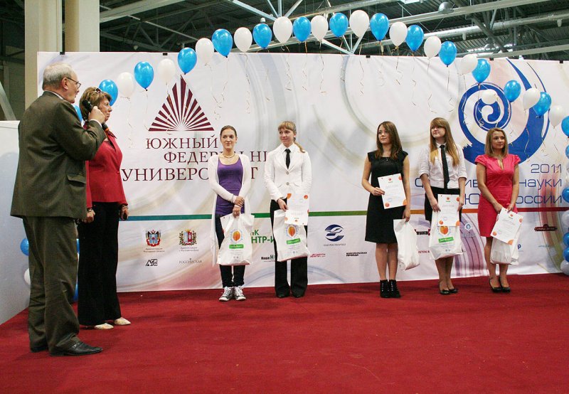 Заместитель председателя Ростовского областного отделения Союза журналистов России Оксана Антоновна Аксенова и директор Информационного центра по атомной энергии Ростова-на-Дону Алексей Стратонович Боровик на сцене выставочного комплекса «Вертол Экспо» вручили финалистам первого этапа конкурса «Будущее — это мы» дипломы победителей и ценные подарки.